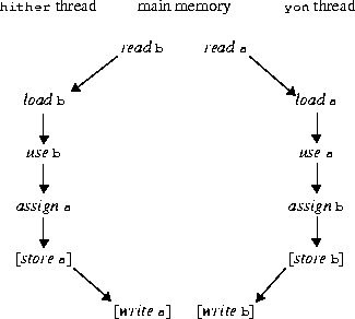 In what order may the actions by the main memory occur? The only constraint is that it is not possible both for the write of a to precede the read of a and for the write of b to precede the read of b , because the causality arrows in the diagram would form a loop so that an action would have to precede itself, which is not allowed. Assuming that the optional store and write actions are to occur, there are three possible orderings in which the main memory might legitimately perform its actions. Let ha and hb be the working copies of a and b for the hither thread, let ya and yb be the working copies for the yon thread, and let ma and mb be the master copies in main memory. Initially ma=1 and mb=2 . Then the three possible orderings of actions and the resulting states are as follows: