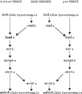 Let us again consider the thread that calls hither . According to the rules, this thread must perform a lock action (on the class object for class SynchSample ) before the body of method hither is executed. This is followed by a use of b and then an assign of a . Finally, an unlock action on the class object must be performed after the body of method hither completes. That is the bare minimum required to execute a call to the method hither .