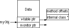 In the design of the native code interface in the Microsoft VM, this article has addressed many of the implications of prior interfaces as discussed previously. Internally, object references are pointers directly to the object. The following diagram describes the internal storage details of objects within the Microsoft native code model.