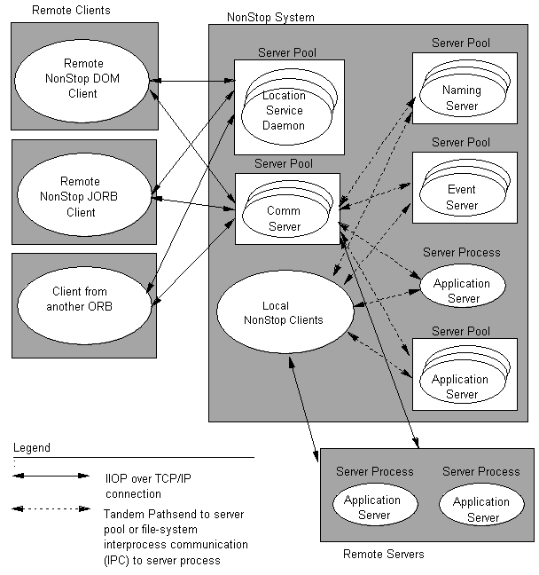 As a CORBA-compliant ORB, the NonStop DOM system can communicate across heterogeneous networks. In addition, the NonStop DOM system implements other OMG services, such as the Naming Service, Event Service, and Transaction Service. Both application clients and object servers can use these CORBAservices.