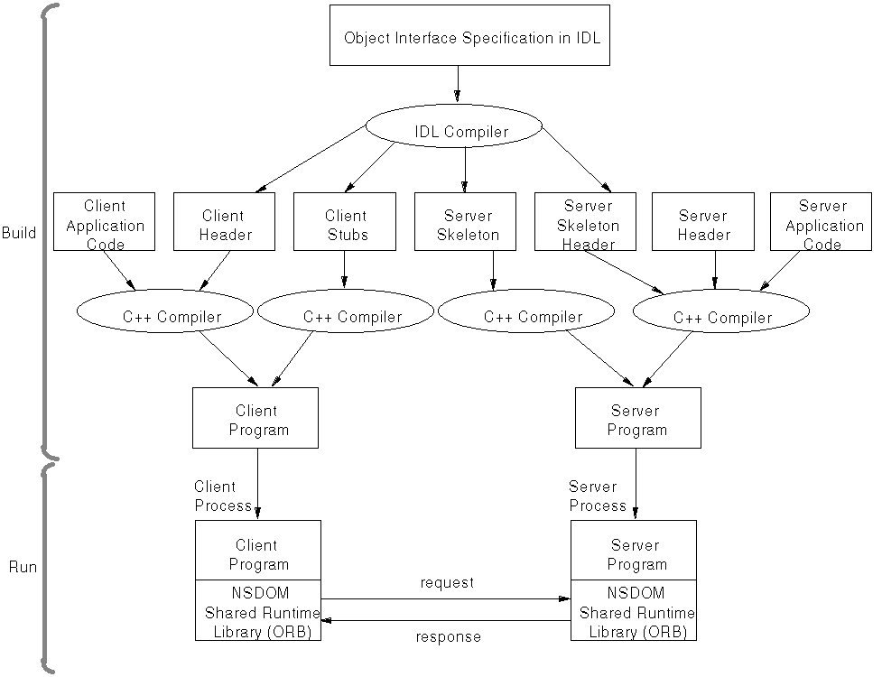- The server skeleton code produced by the IDL compiler is compiled producing an object file.