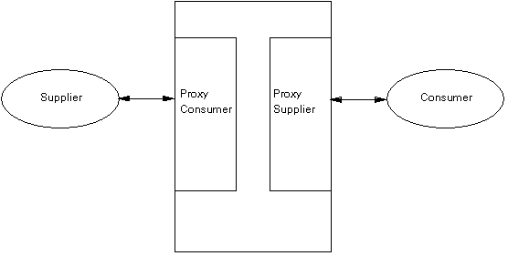 Consumers and suppliers interact with each other indirectly through the event channel. To the consumer, the event channel appears to be an event supplier. To the supplier, the event channel appears to be an event consumer. So the event channel supplies proxy objects to consumers and suppliers. These proxy objects bear the correct interface such that the consumers and suppliers appear to be interacting with each other directly. Figure 2 illustrates the concept:
