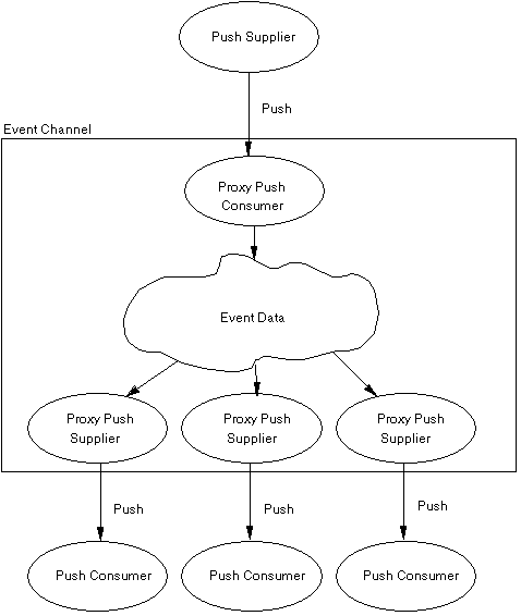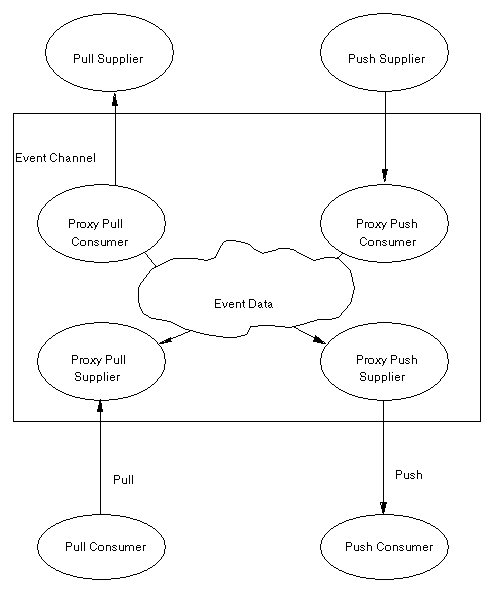 Since the event channel acts as an intermediary, suppliers are unaware of the communication model used by consumers and consumers are unaware of the communication model used by suppliers. So, a push supplier can provide data to a pull consumer and a pull supplier can provide data to a push consumer.