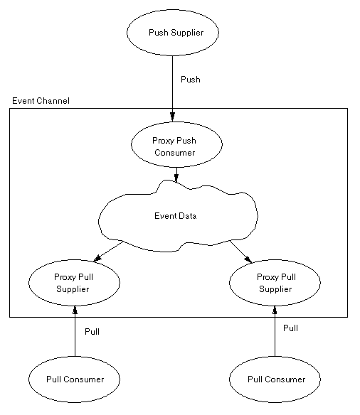 Here the push supplier interacts with the proxy push consumer in the event channel. Two pull consumers are registered, so there is a proxy pull supplier for each one. When the push supplier pushes an event, the proxy push consumer receives it. The event channel stores the event until it is requested (pulled) by the pull consumers. A pull consumer that requests an event when none is available must wait until one arrives.