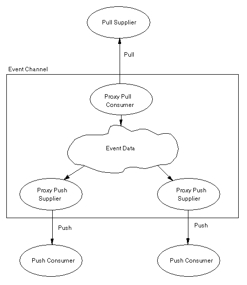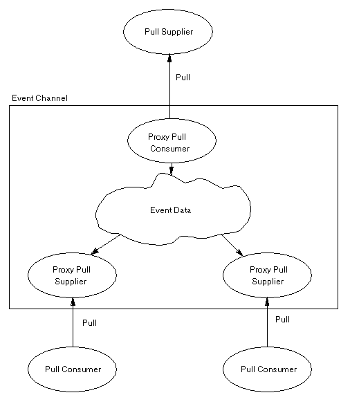 Here the pull supplier interacts with the proxy pull consumer in the event channel. Two push consumers are registered, so there is a proxy push supplier for each one. In this (possibly unusual) configuration, neither the pull supplier nor push consumer initiates an interaction. The event channel assumes the role of initiator. The proxy pull consumer periodically makes pull requests on the pull supplier. When an event is available, the proxy push suppliers push it to the push consumers.