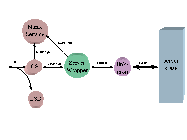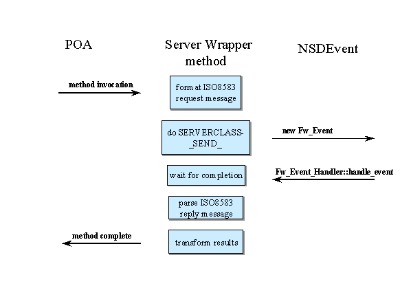 The difference between a server wrapper and a pure CORBA application is shown by the Worker. Its methods are dispatched the same way, but the method implementation involves communicating with the wrapped system using NSDEvent components directly.
