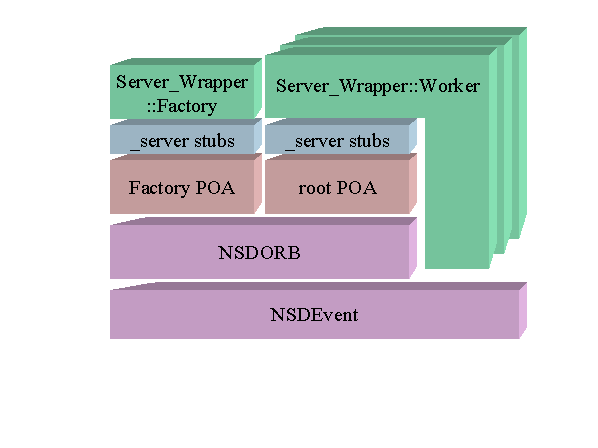 The internal architecture of this wrapper is basically the same as any NonStop DOM 2.0 process. The NSDEvent parts are used to normalize the interaction with the NonStop Kernel platform. The NSDORB parts use NSDEvent parts to perform the work of sending and receiving GIOP messages, and queue requests for the Portable Object Adapters (POAs). The POAs dispatch methods on the factory and workers through the stubs generated by the IDL compiler.