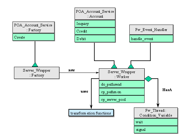 In addition to inheriting from the POA class, the Worker inherits from the Fw_Event_Handler class and overrides the handle_event method. The Worker has a condition variable that is used while awaiting the completion of the SERVERCLASS_SEND_ operation. The Worker uses transformation functions to convert between method parameters and ISO8583 messages. Lastly, the Worker introduces a method of its own to perform a SERVERCLASS_SEND_, wait for the completion, and interpret the results.