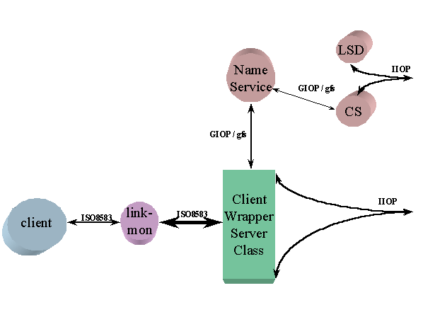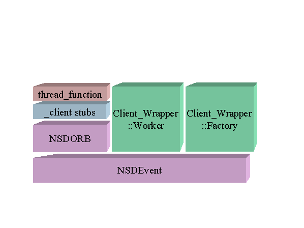 The internal architecture of the client wrapper is a mixture of a Guardian File System (GFS) server and CORBA client. The Factory uses NSDEvent parts to wait for OPEN messages on $receive (from the LINKMON process). When it receives an OPEN, the Factory creates a Worker to service that GFS connection.