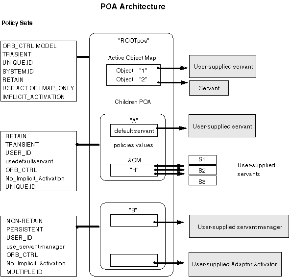 The characteristic behavior of a POA (other than the root POA) is determined at the time of its creation by using policies. Once set, policies cannot be changed during the life of the POA. The policies are not inherited by child POAs.