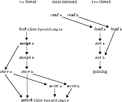 In what order may the actions by the main memory occur? Note that the rules do not require that write a occur before write b ; neither do they require that read a occur before read b . Also, even though method to is synchronized , method fro is not synchronized , so there is nothing to prevent the read actions from occurring between the lock and unlock actions. (The point is that declaring one method synchronized does not of itself make that method behave as if it were atomic.)
